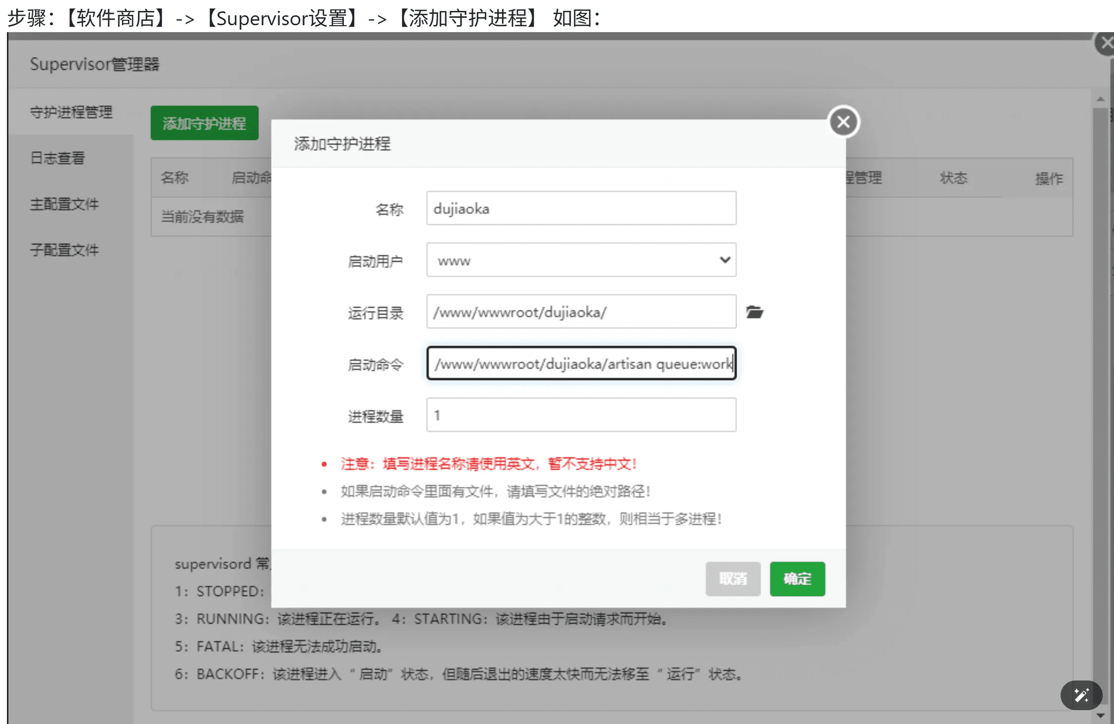 - 启动命令:/www/server/php/74/bin/php /www/wwwroot/你的域名/artisan queue:work
