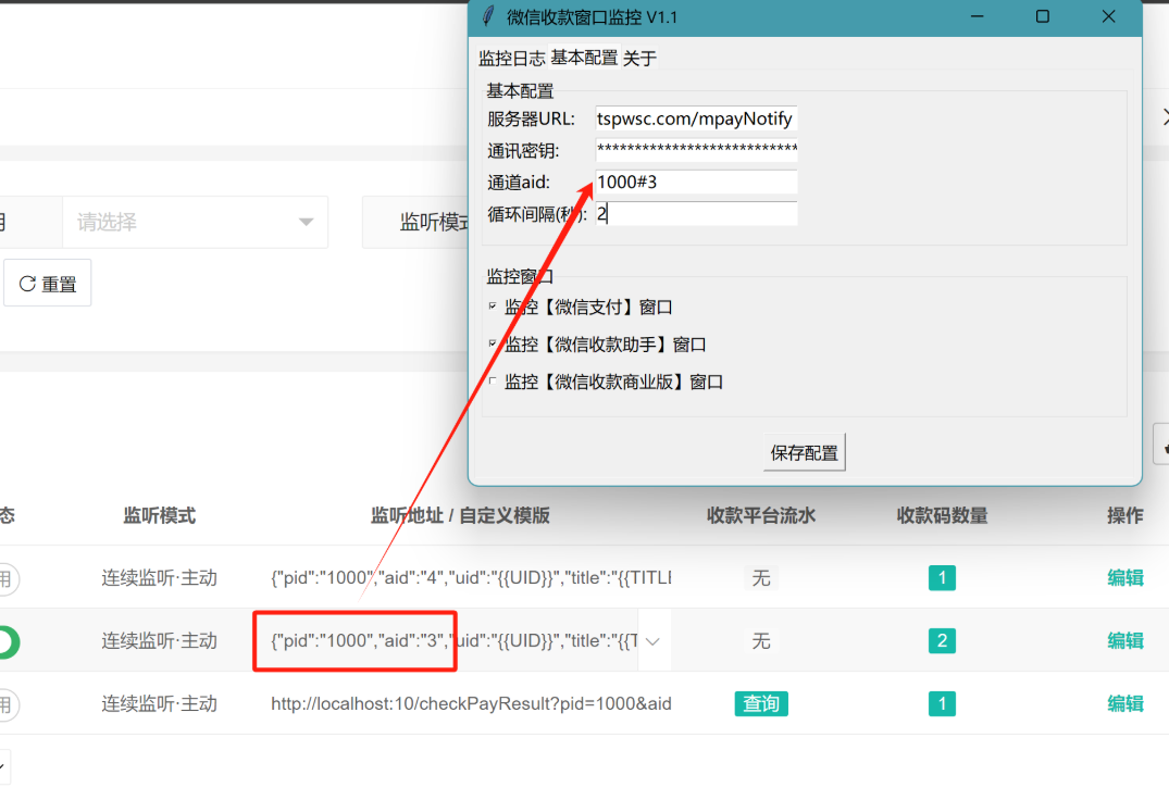 - 监控窗口根据实际情况勾选,哪个窗口需要检索收款通知,就开启哪个,不使用的就不需要开启