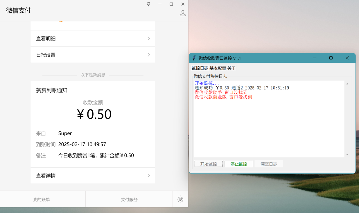 码支付微信PC监听,是使用python写的小工具,可以监听电脑桌面打开的窗口和内容信息,非侵入微信应用内部,版本升级不影响监听。需要将被监听的微信聊天界面单独拖出来成独立窗口。