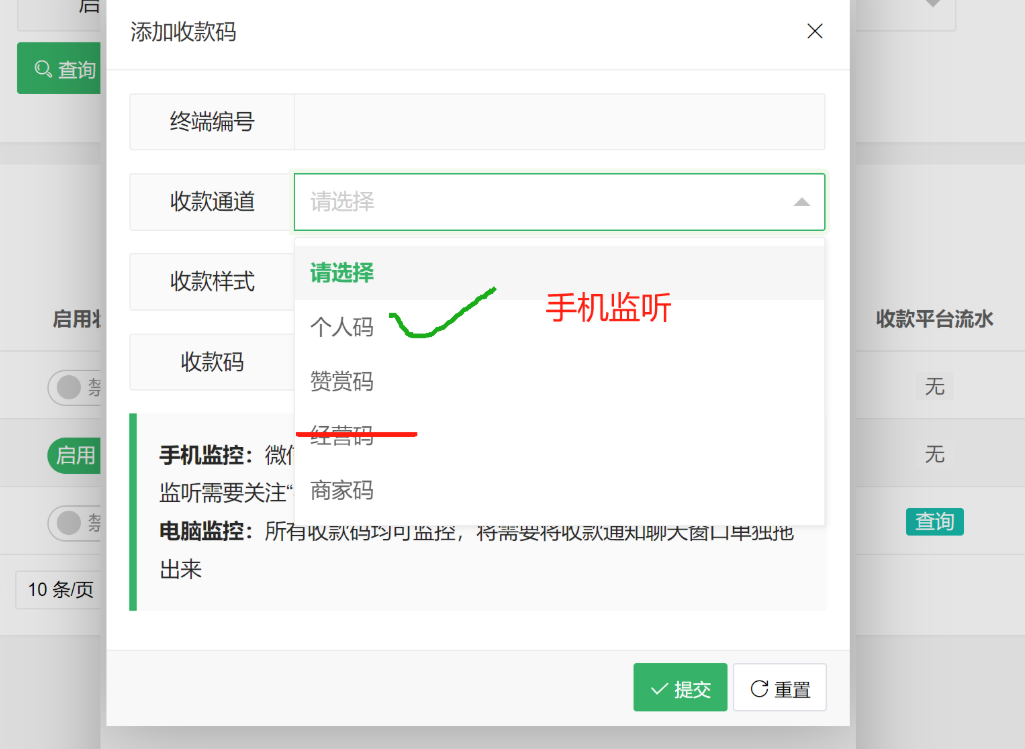 - PC监听同时支持个人码、经营码、赞赏码、商户码,手机监听因无法区分个人码和经营码,添加时只能二选一,且只能在