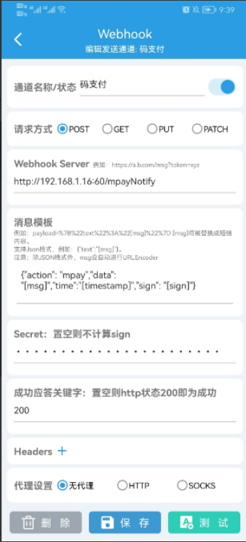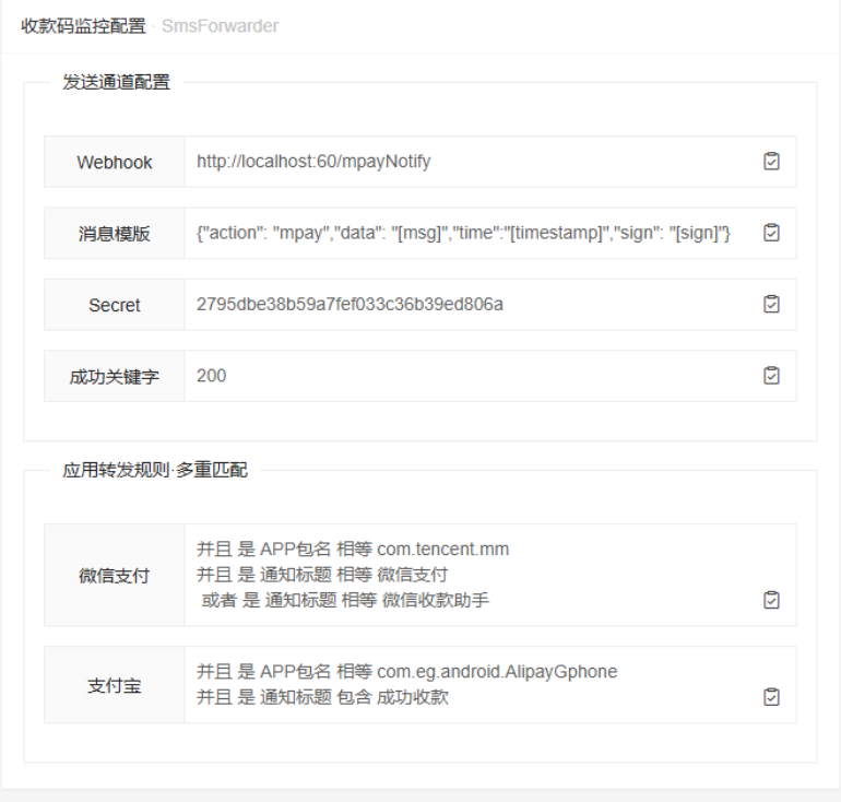 码支付使用的是开源工具短信转发器SmsForwarder来监听收款通知,SmsForwarder功能非常强大,喜欢搞机 的朋友可以多钻研,这是使用文档,短信转发器——监控Android手机短信、来电、APP通知,并根据指定规则转发到其他手机:钉钉机器人、企业微信群机器人、飞书机器人、企业微信应用消息、邮箱、bark、webhook、Telegram机器人、Server酱、PushPlus、手机短信等。