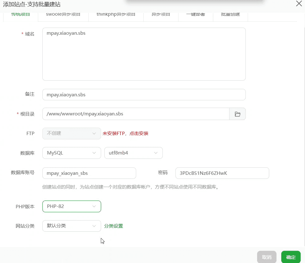 2)通过宝塔面板登陆管理后台,新建PHP站点和数据库,并确认创建
