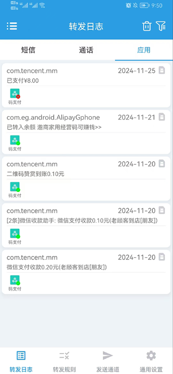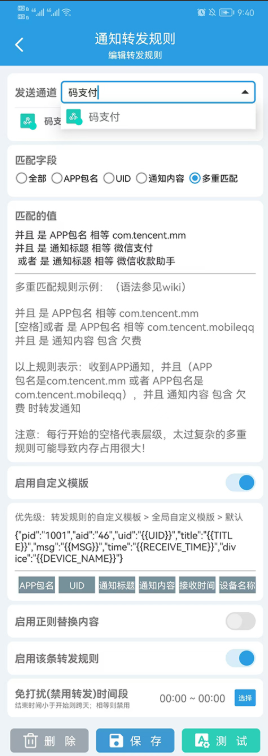 添加应用转发规则,微信和支付宝需要分别设置,请注意选择应用规则