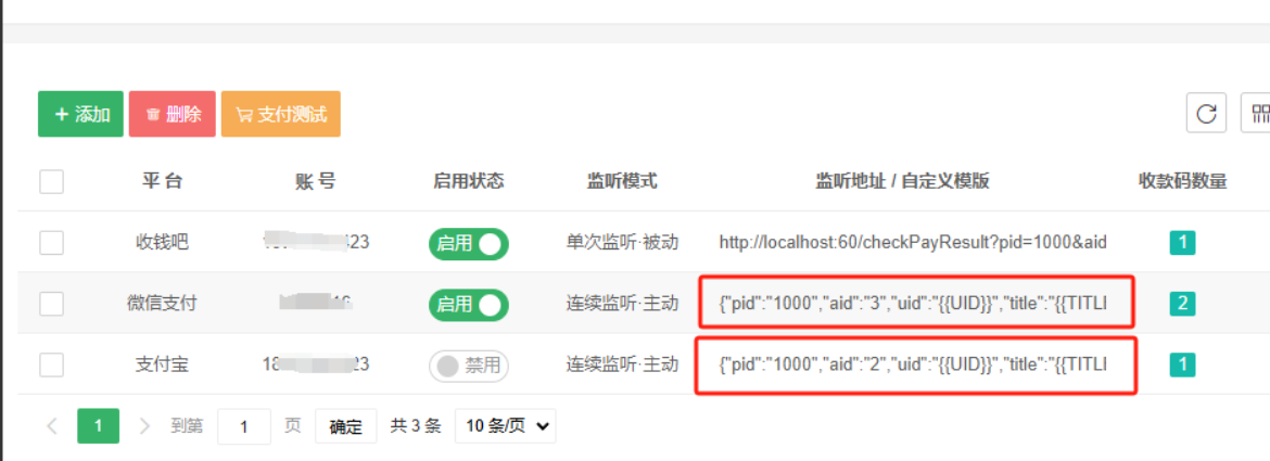 账号监听:有多少个收款账号在使用,就设置几个,在账号管理的表格监听地址列可以看到