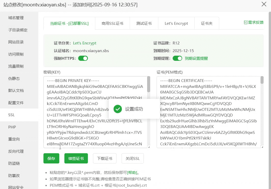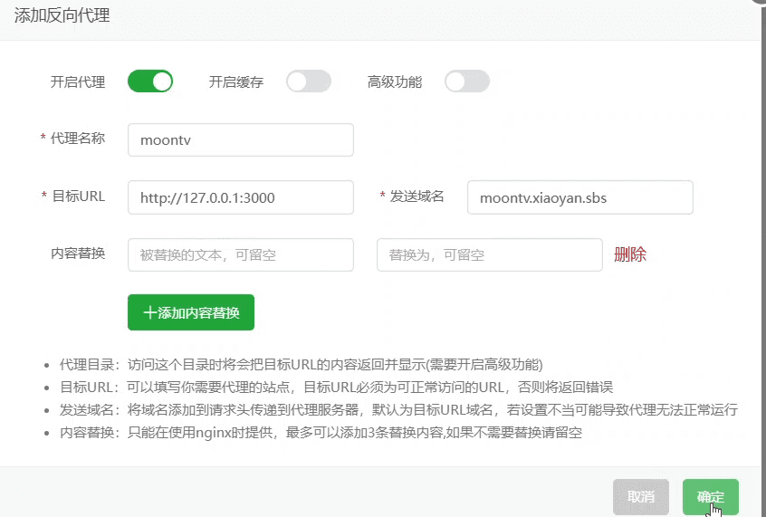 目标URL:http://127.0.0.1:3000 发送域名:moontv.xiaoyan.sbs 保存后测试访问